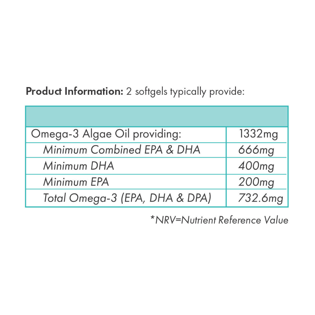 Algal Oil (Schizochytrium Sp. Oil, High Oleic Sunflower Oil, Rosemary Extract, Tocopherols, Ascorbyl Palmitate), Capsule Shell (Modified Corn Starch, Glycerol, Carrageenan, Sodium Carbonate Anhydrous).